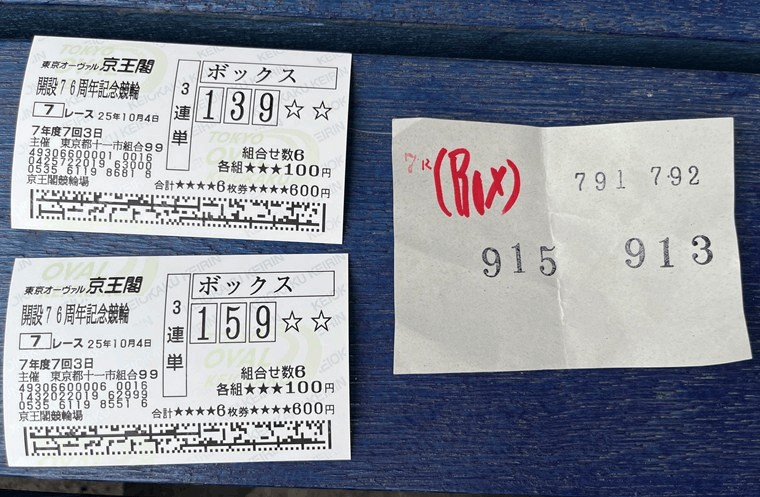京王閣競輪場で予想を購入したのは2025年10月4日(土)「G3 第76周年 ゴールドカップレース」の3日目第7Rです。体験レポなので、今回はそのままの買い目で車券を購入します。